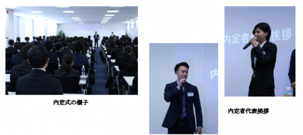 当社には新入社員の入社を歓迎する文化が有ります。内定式では、全国の内定承諾者105名(10月1日時点)が当社の東京五反田セミナールームに集結し、当社の代表である水谷や取締役、執行役員からの祝辞をはじめ、内定者代表挨拶や内定者全員による自己紹介等が行われ、大いに盛り上がりました。