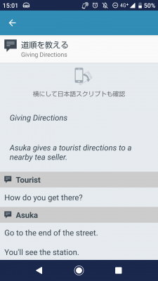 ストーリーは外国人観光客が知りたいことに応えたり、困っている場面で対応したりという内容です。コンテンツ構成は聞き流し編のほか、用語をまとめた単語・フレーズ集、実際に口から出すところまで練習できるリピート練習と、実践で使える構成となっています。