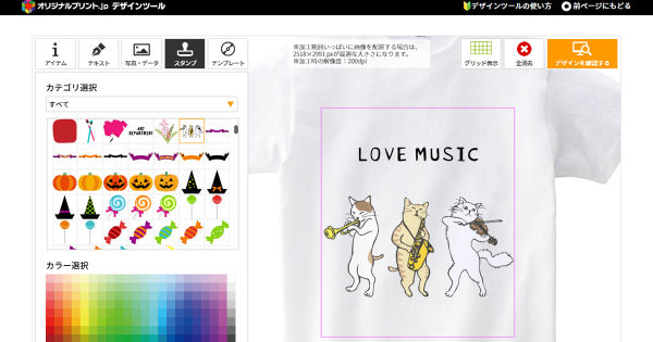オリジナルプリント.jpが搭載する「デザインツール」を使い、簡単にデザインデータを入稿することができます。もちろん「デザインツール」で無料提供しているスタンプやデザインテンプレートも使い放題です。