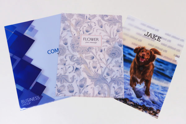 オリジナルプリント.jpのクリアファイルは、裏表全面に鮮やかなフルカラープリント対応です。UVオフセット印刷で高級感のある仕上がりに。フチの部分やファイルの圧着部分のすみずみまでデザインの配置が可能です。