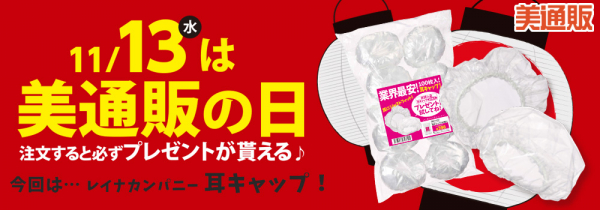 次回の「美通販の日」は、11月13日(水)。今回のプレゼントアイテムは、「耳キャップ 50枚入」(レイナカンパニー)。お客様の耳を汚れや水からしっかり守る人気のサロンアイテムを、注文された方全員にプレゼントいたします。