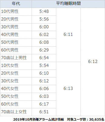 今回の統計では、男女全年代の平均睡眠時間は6時間12分でした。