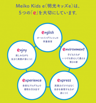 「Meiko Kids e(明光キッズe)」は、日本の将来を担う子どもたちにオールイングリッシュの環境を与え、グローバル化する世界で生き抜く人材を育成することを目指した学童保育施設です。“自然・季節”、“文化・芸術”、“社会”の3つのテーマに基づいたオリジナルのプログラムで、グローバル社会で通用する生きた英語を楽しみながら身につけることができます。