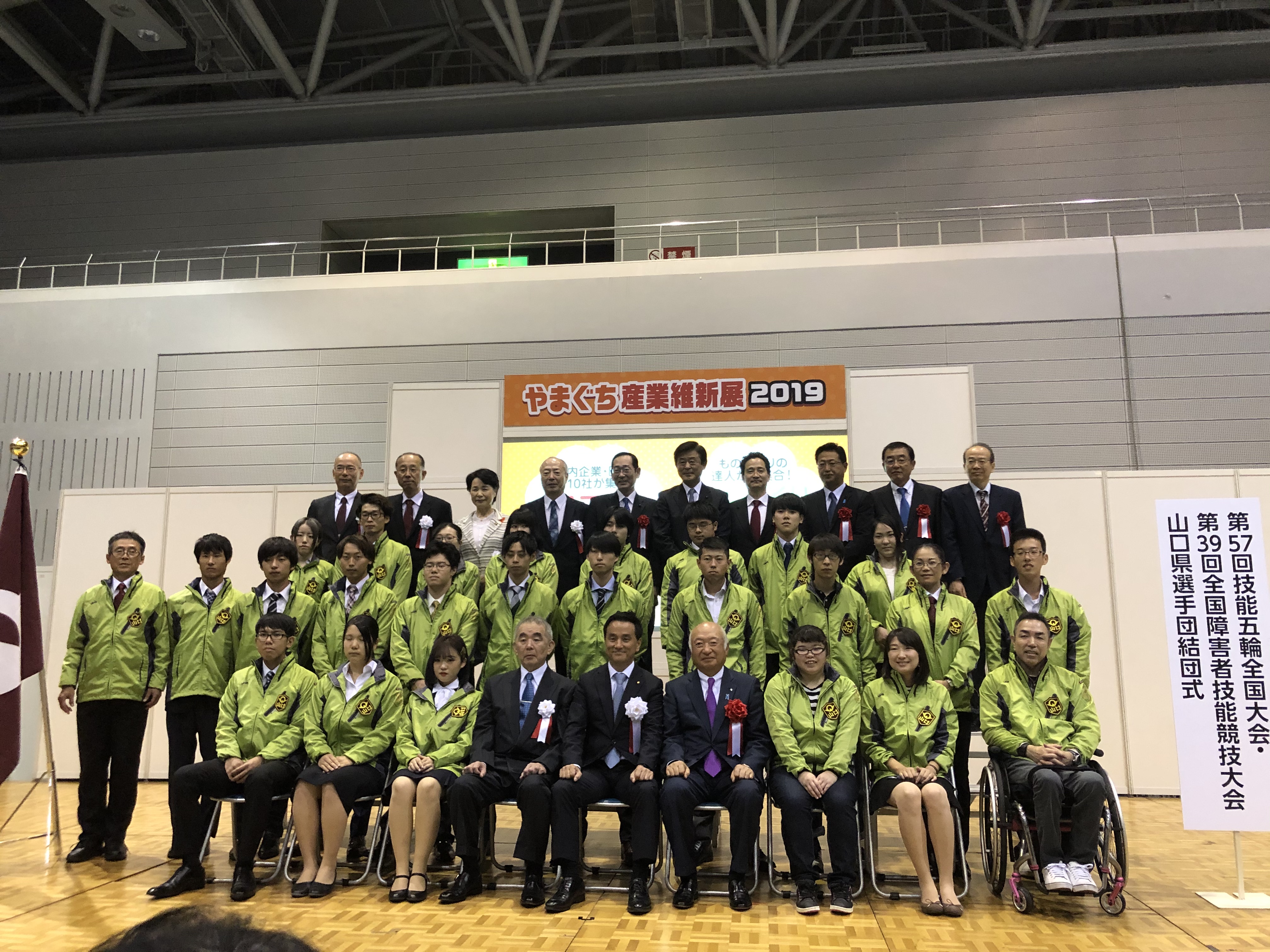 有限会社栗栖工業(本社:山口県宇部市船木1236番地、以下 当社)は、2019年(令和元年)11月15日~18日に開催される【第57回技能五輪全国大会(愛知県)とび職種】へ、社員の西村真人(にしむらまさと22歳)が出場することが決定し、山口県選手団結団式に参加しました。結団式は、令和元年10月26日(土曜日)10時30分から「やまぐち産業維新展2019」オープニングセレモニーに引き続き実施されました。会場は、キリンビバレッジ周南総合スポーツセンター メインアリーナで、やまぐち産業維新展2019のステージイベントとして、開催されました。