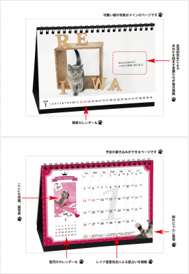 1.片面は大きな猫写真にカレンダー、もう一方の面は書込みタイプの使いやすい両面カレンダー