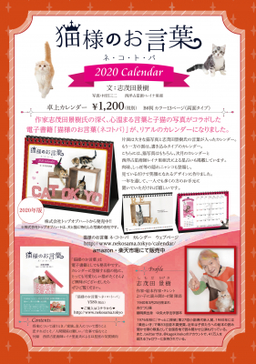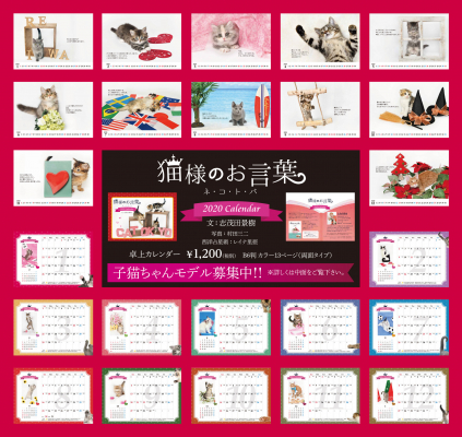 犬猫に特化した写真撮影及びストックフォトサービスを提供する株式会社トップオブハート(所在地:東京都新宿区)は、2019年11月15日より、作家・ 志茂田景樹氏とのコラボによる2020年版『猫様のお言葉 ネ・コ・ト・バ』卓上カレンダーの販売を開始しました。一年を通していつも側にあるものだからこそ、大人可愛いデザインで、お部屋のインテリアとしてもお洒落にご利用いただけます。上手くいく日も、いかない日も、子猫たちに癒され、 励まされ、隠れニャンコや星占いで、使って楽しい宝箱のようなカレンダーです。