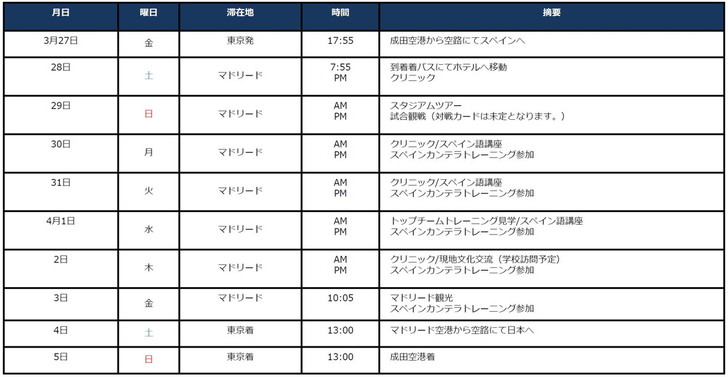 スペイン国内での宿泊費・食事の費用、帯同スタッフ・通訳費用・サポート費用、現地交通費・スタジアムツアー費用、練習参加費・コーチ指導費、飛行機・燃油料代