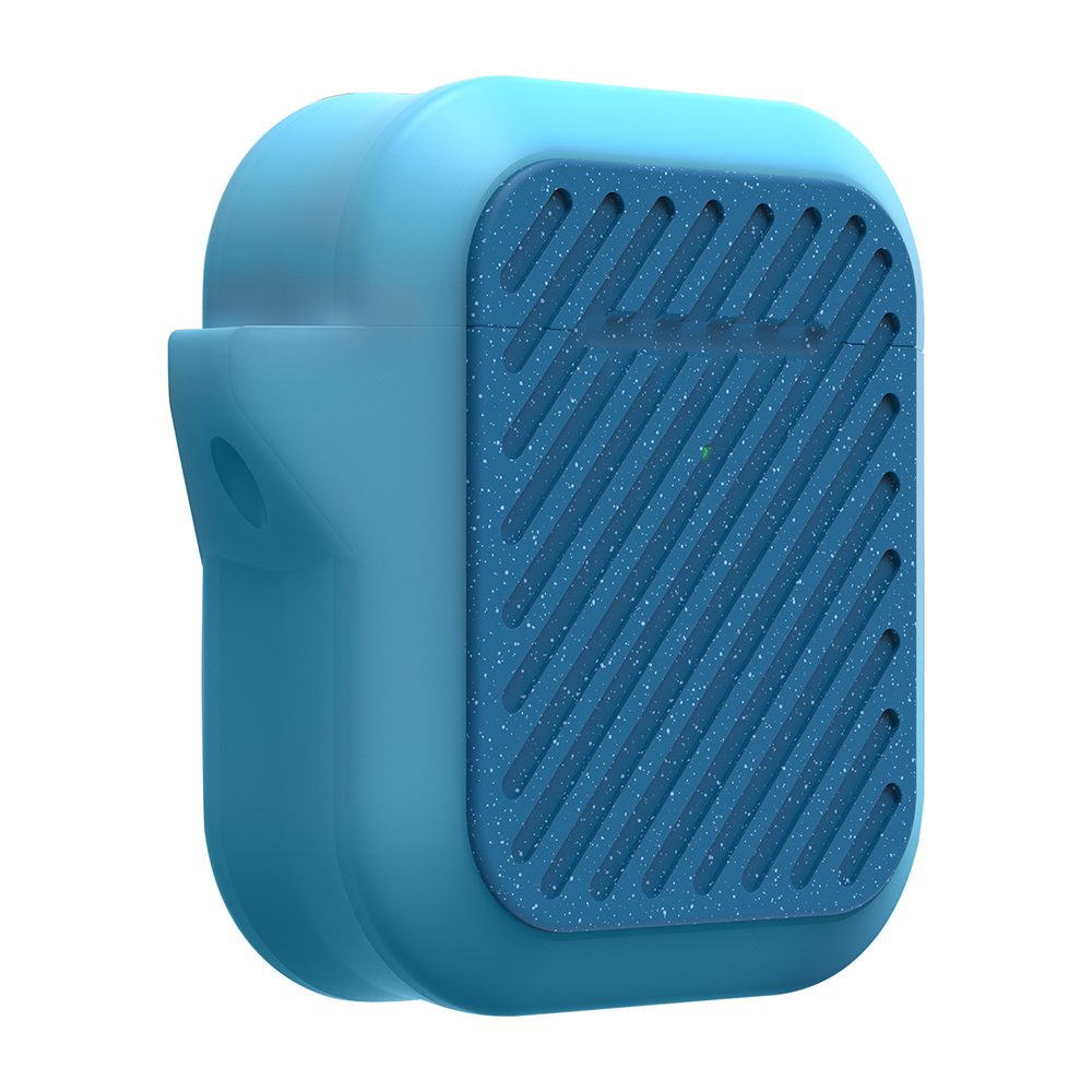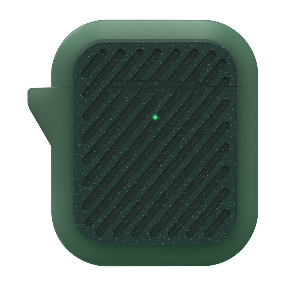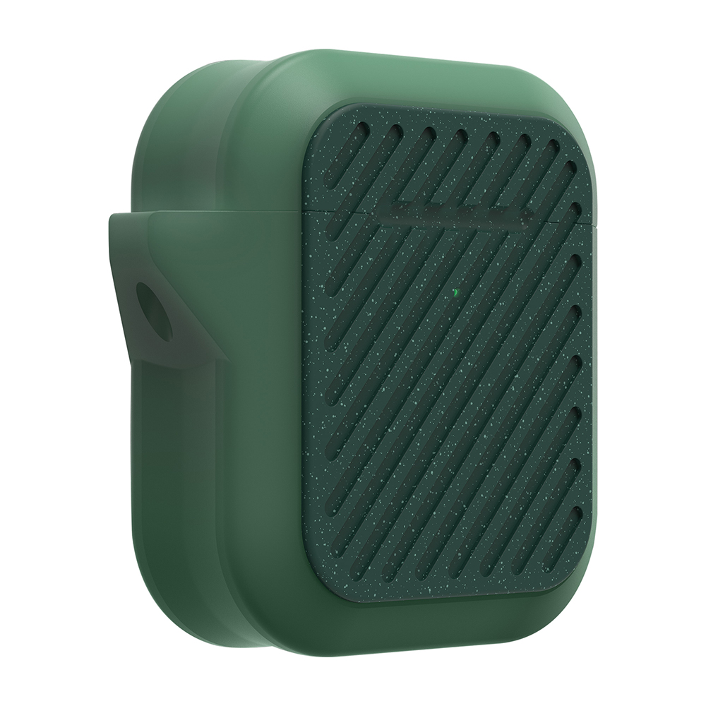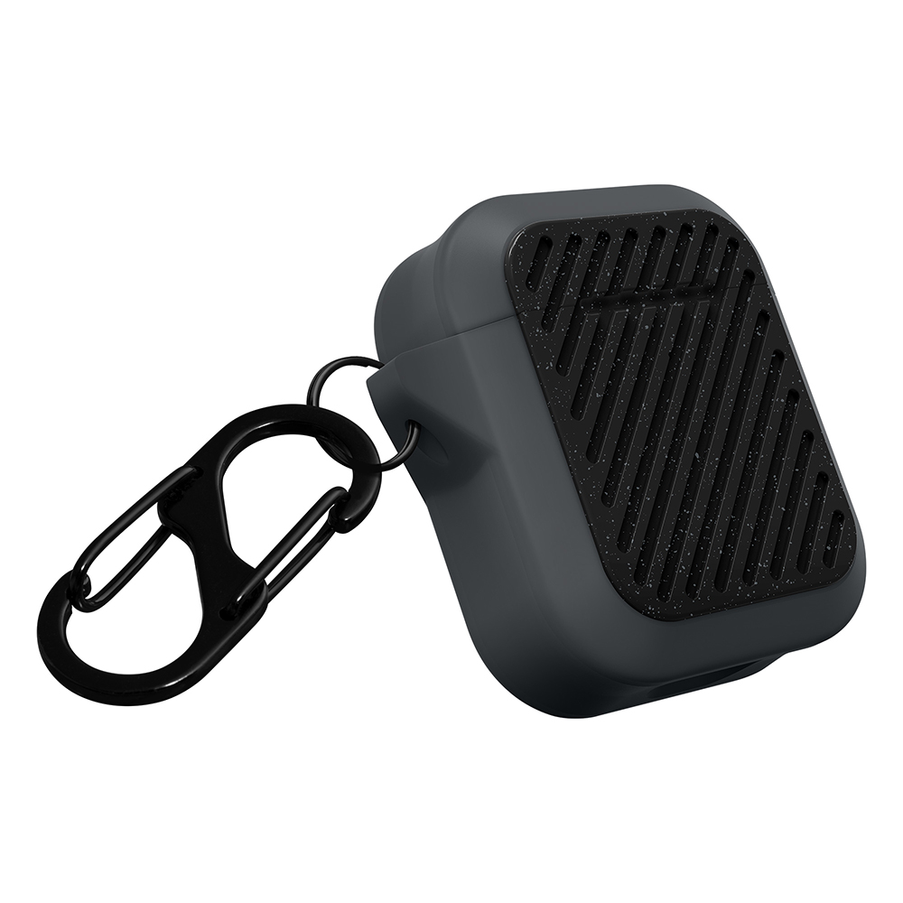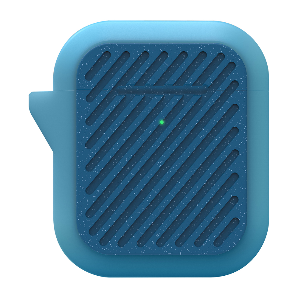 ゴルフボールにも使われる衝撃エネルギーを吸収分散する高分子素材に硬質ポリカーボネートパネルを埋め込んだハイブリッド構造。内部のコアが硬く、外部は適度な柔らかさと弾力性があり、4mの落下テストをクリア、ショックを吸収してAiPodsを守ります。