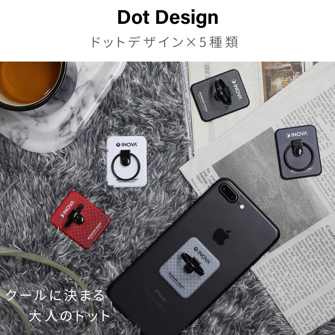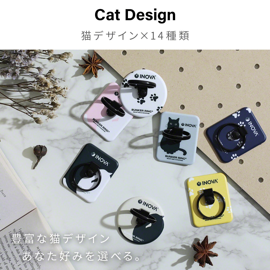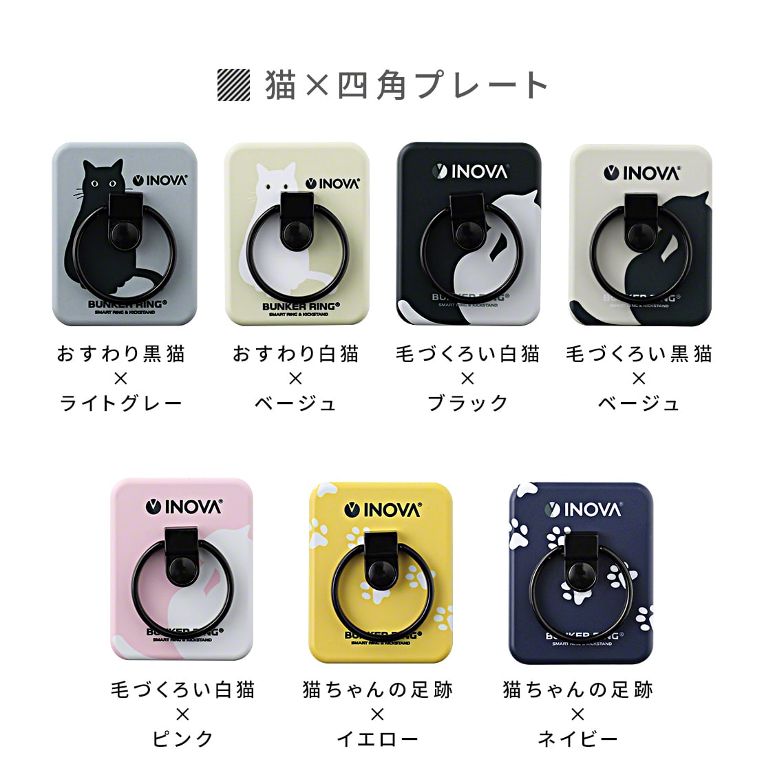 今回、INOVAとバンカーリングがコラボし、猫デザイン・クールなドットデザイン・ベーシックなシンプルデザインなど、当社だけのオリジナルデザイン全24種類が登場しました。