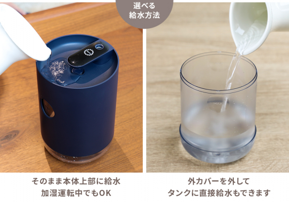 本製品はコンパクトな卓上サイズ加湿器では珍しい「上から給水」に対応しており、加湿運転中でも本体上部にそのまま水を注ぐだけで給水が可能です。