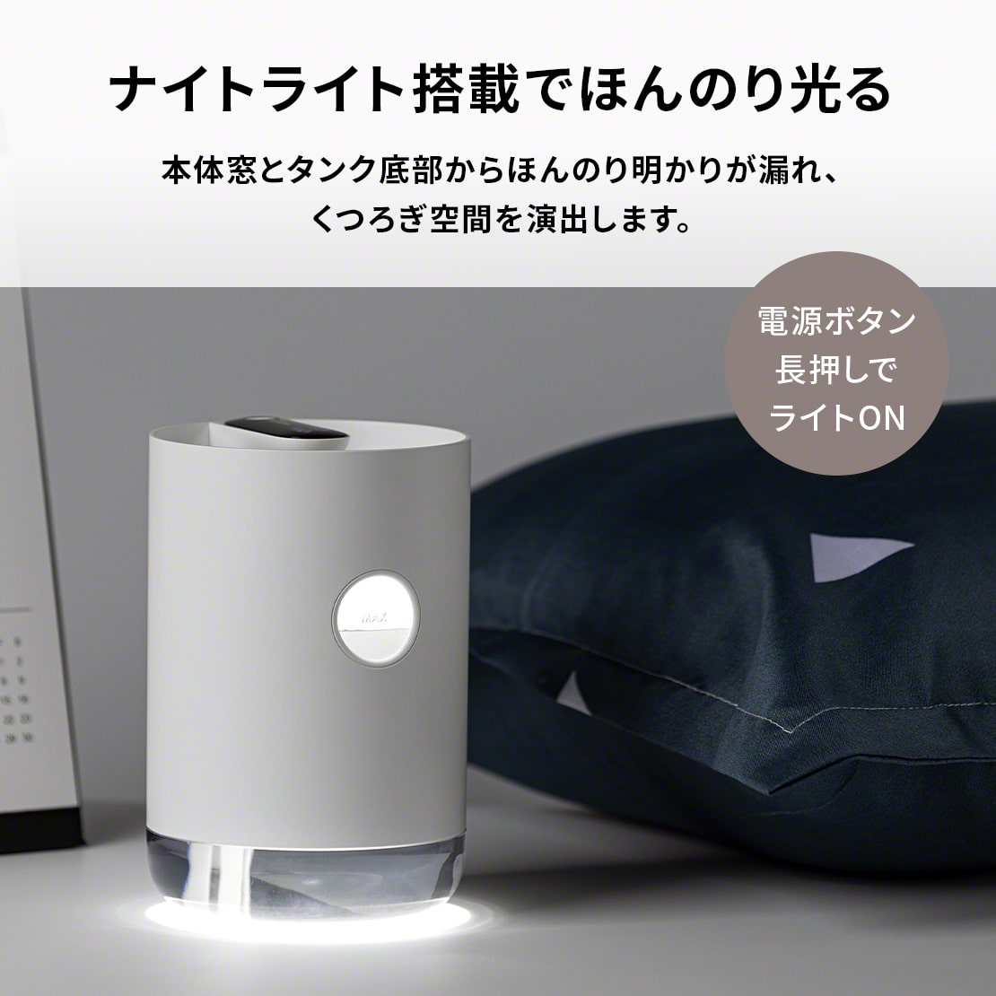 コンパクトながら卓上サイズの中では大容量の約800mlタンクで、長時間の加湿が可能です。(連続運転時間約6~8時間)