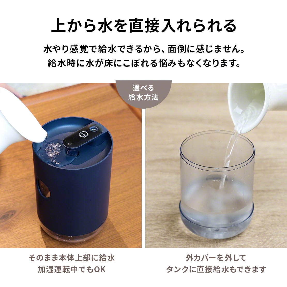 ・加湿運転中でも本体上部から水やり感覚で給水が可能