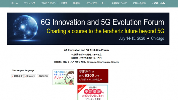 2020年7月14日から15日まで、米国イリノイ州シカゴで開催される6G Innovation and 5G Evolution Forumは、さまざまな業界の企業が6Gのもたらすビジネスチャンスを活かすための準備を整えることができるよう後押しするイベントであり、さまざまな組織で技術開発や戦略策定、研究に携わっている専門職が一堂に会して、6Gの可能性を展望するとともに、5Gを基盤として将来の市場のニーズに対応していくための方策について議論します。会期中は、関連業界の主要な企業の幹部による講演やパネルディスカッションが予定されており、ネットワークや機器、事業運営、ソリューションなどを含めた6G通信のエコシステムを構築するための貴重な情報を入手することができます。