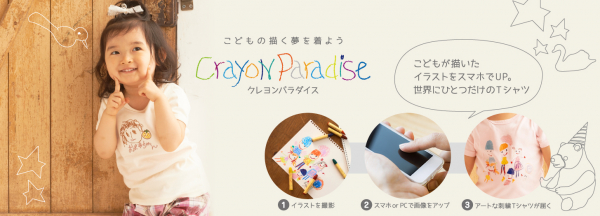 JAZYブランディング株式会社(東京都千代田区内幸町2-2-1日本プレスセンタービル6F)は、こどもが描いたイラストをスマホで撮影、アップロードするだけで世界にひとつだけの刺繍Tシャツを製作するサービス「クレヨンパラダイス」を2019年12月にリニューアルOPEN。