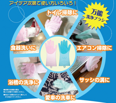 多機能お掃除手袋「ウォッシュハンド」は、シリコン製手袋の表面と裏面の両面にブラシをつけることで、指先を使い細かいところまで掃除ができる、毎日忙しい主婦のためのお掃除時短アイテムです。