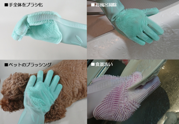 「ウォッシュハンド」は、手にはめて使用するため、手を汚すことなくお掃除ができます。シリコン製のためゴム手袋のような嫌な臭いもしません。シリコンは耐熱性が高く、煮沸消毒や電子レンジで殺菌することで衛生的に使用できます。また、熱伝導率が低く、冬場の冷たい水でもほとんど冷たさを感じないため、これから年末の大掃除の時期に活躍します。