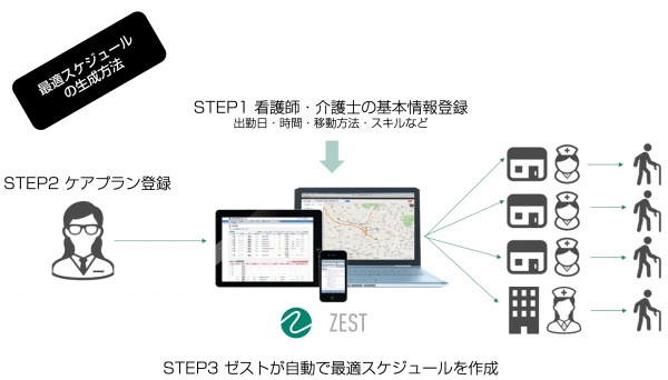 加えて、スケジュール効率化によって、訪問医療に携わるスタッフ(医師、看護師、介護士、療法士など)1人あたりが訪問できる利用者が増え、足りないと言われている介護・在宅医療業界の人手不足が解消することに繋がり、ひいては多くの利用者が医療サービスを受けられるようになります。