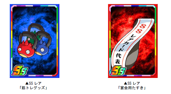 ダンジョンのボスモンスターを倒すと、まれに新たな限定子分カード「筋トレグッズ」や「宴会用たすき」が手に入ります。