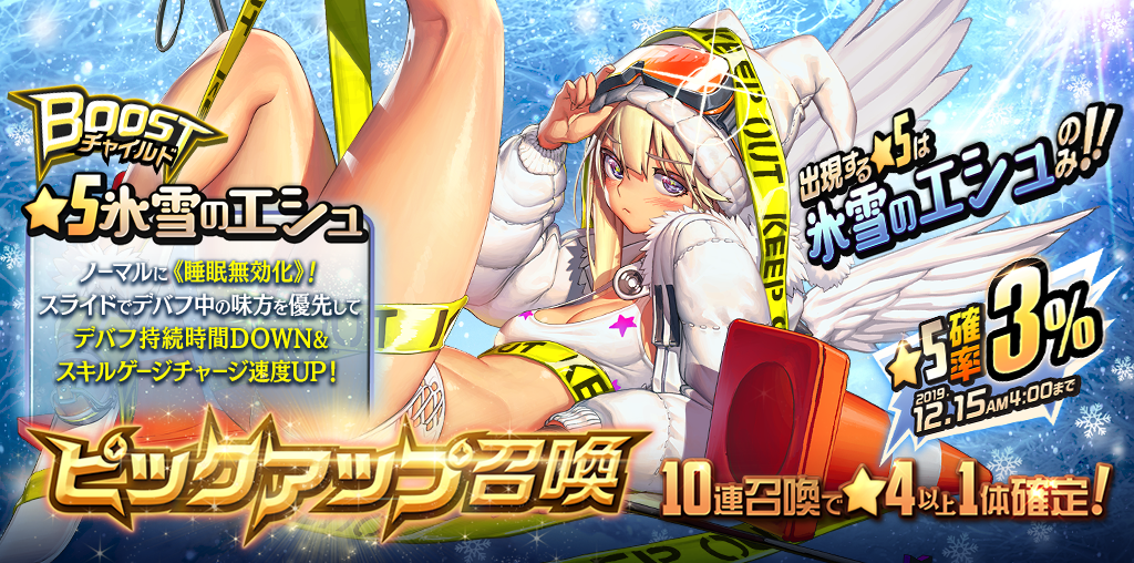 今回のBOOSTチャイルド★5光属性補助型「氷雪のエシュ」(CV.牧野由依)と★5光属性回復型「ヴィーナス」(CV.楠木ともり)の単体ピックアップ召喚が開催しております!