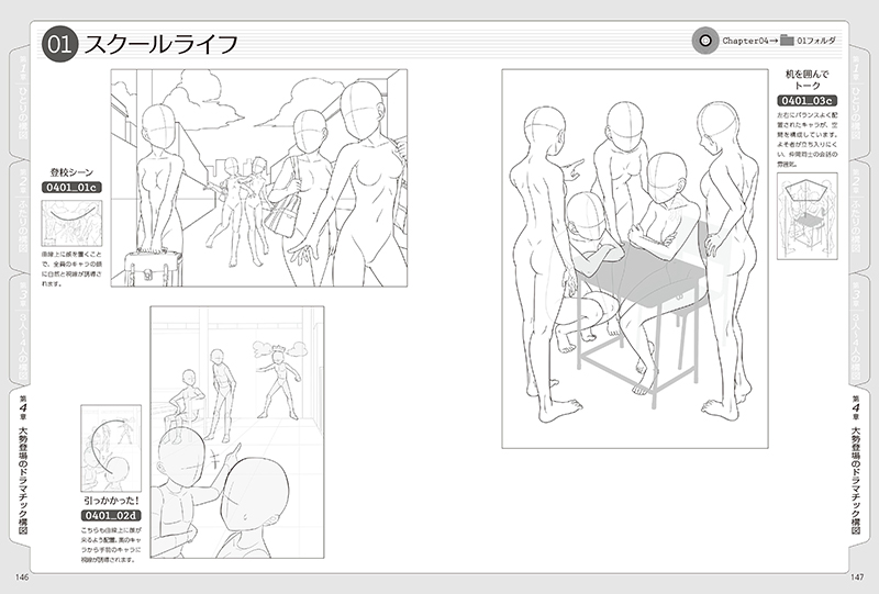 ひとりのキャラをかっこよく見せる構図はもちろん、恋人の関係性を表現する構図、大勢のキャラが集まったグループの構図なども掲載。一枚絵のイラスト、ポスター、同人誌の表紙などに幅広く活用できます。
