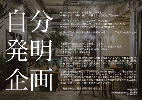【ヤンバルホステルが、クリエイターの多拠点生活や、今の社会に悩む人達に送るサービス『自分発明企画』をリリースします。】