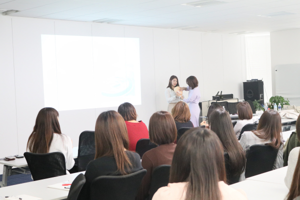 今回は毎日できるスキンケアと正しい美容法についてご講演いただきました。「美」は健康な体と健康な心で成り立っているということから、正しい化粧品の選び方や肌トラブルの改善方法、心の調子を整えるインナーケアの方法についてお話いただきました。女性にとってお肌の調子はモチベーションに大きく影響するとのお話に、「毎日続けられるちょっとした美肌計画を実践します」という社員の声が多い回となりました。