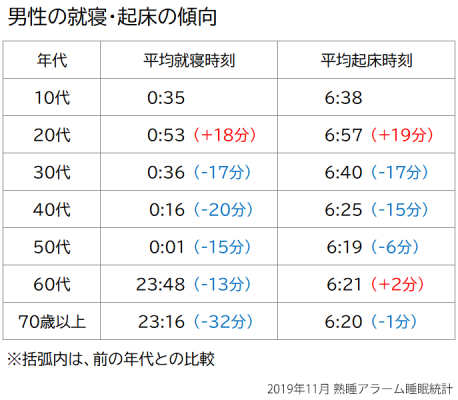 20代男性:平均就寝時刻が0:53、平均起床時刻が6:57でした。10代に比べて明らかに遅寝、遅起きの傾向になります。
