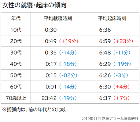 20代女性:平均就寝時刻が0:49、平均起床時刻が6:59でした。10代に比べて明らかに遅寝、遅起きの傾向になります。