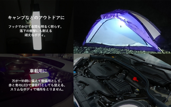 SOS信号や青色・赤色LEDライトの点滅・点灯で車両追突防止や事故発生時の安全確保に役立ちます。