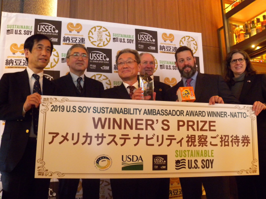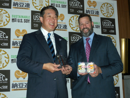 本アワードは、日本一の豆腐、納豆を審査する「第5回全国豆腐品評会」(主催:全国豆腐連合会、開催:2019年10月2日)、「第24回 全国納豆鑑評会」(主催:全国納豆協同組合連合会、2019年2月22日)において、「地球に優しい米国産大豆を使用していることの証明書を取得している、分別生産管理された食品大豆」を使用して作られた優秀製品にUSSECが授与するものです。今年度、豆腐部門ではさとの雪食品(株)(徳島県鳴門市)/四国化工機(株)(徳島県板野郡)の『こくとろ。』が、納豆部門では(株)小杉食品(三重県桑名市)の『おちびさん つゆだく」がそれぞれ受賞し、記念トロフィーとピンバッヂのほかサステナビリティ米国視察招待券が授与されました。
