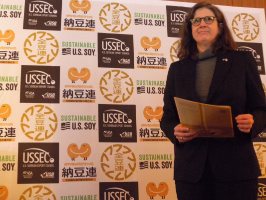 「この度、米国大豆のサステナブル認証、SSAPを受けた大豆を使用して、高品質な大豆商品を製造していただいた、さとの雪食品様、小杉食品様に改めて感謝いたします。日本は分別流通された大豆の世界最大の市場です。2018年、その数量は100万トンを超え、うち36万4,000トンが米国から供給されており、米国の単一品種の輸出は2012年比で53%増加しています。100万トンを超える日本の食品大豆市場のうち、豆腐用の大豆が最も大きな比率で52%以上を占めており、その中の41%以上が米国から供給されています。また、日本で作られる納豆の原料のうち70%は米国から供給されています。こうした強固なパートナーシップを納豆、豆腐両分野において維持しつづけていることを嬉しく思います。USSECでは、サステナビリティを非常に重視しており、会議やイベントでもその重要性を強調しています。SSAPのロゴを使うことで、皆様の会社の持続可能性への取り組み、CSRやより良い未来への取り組みを消費者に対して伝えることができるでしょう」