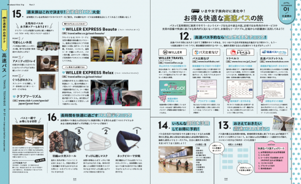 内容は二部構成になっており、前半はLCCや女子旅向けの高速バスなど交通費を節約する具体的なテクニックをはじめ、おしゃれ×低予算を実現するゲストハウスに関するハウツーなど、国内旅行をお得にプランニングするテクニックが満載。