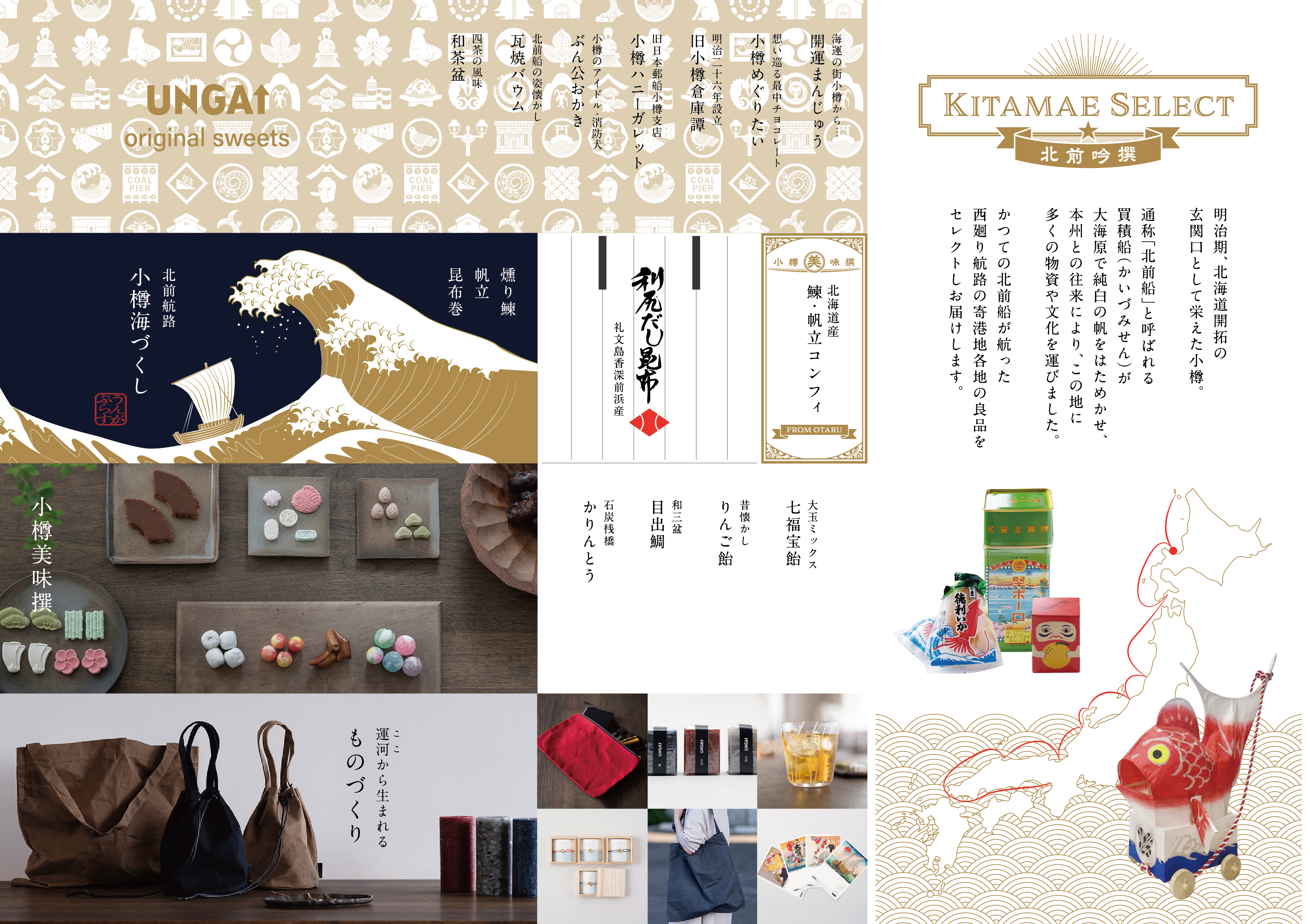 お店での取扱商品は、UNGA↑オリジナルのお土産食品と雑貨に加え、日本文化遺産に選出された北前船寄港地の名産品を取り扱っています。オリジナル商品の一つ一つに小樽や、その歴史の礎となった北前船にまつわるエピソードやコンセプトを添えて製品化しています。新たな小樽の観光拠点のひとつになれるよう皆さまのご来店をお待ちしております。