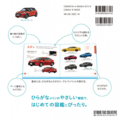 趣味に生きる人のための出版社スタジオタッククリエイティブは、2020年3月上旬に児童書「はじめての くるま ずかん」を発行予定です。丈夫なハードカバーで、3~6歳の‘はじめての図鑑’にぴったり。きれいな切り抜き写真と、ひらがなメインのやさしい解説文の組み合わせで、230台を超える車(乗用車、働く車、オートバイ)を紹介しています。カタカナやアルファベットには、ひらがなのルビが付いているため、文章をひとりで読む力を自然と育てます。言葉や文章理解のサポートできるように、巻末には、ひらがな、カタカナ、アルファベットの表付きです。
