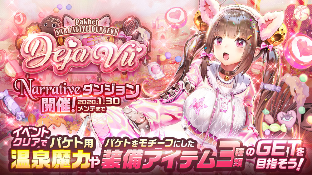 株式会社ステアーズ(本社:東京都新宿区、代表取締役社長 裵 榮珍、以下ステアーズ)は、スマホ版/PC版『デスティニーチャイルド』において、本日1月14日(火)より、イベントアイテムを集め「★5パケト用温泉魔力」や「限定水属性★5召喚チケット」、パケトをモチーフにした「3種類の装備アイテム」などの豪華報酬を手に入れることができるNARRATIVE(ナラティブ)ダンジョン『Deja Vu』を開始しましたのでお知らせいたします。