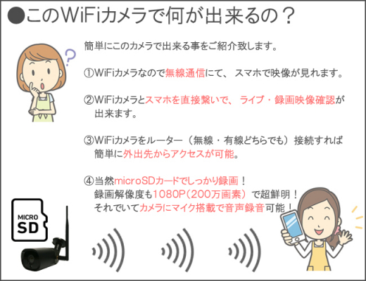 1.防犯カメラでWiFi通信でスマホとかんたん接続。そしてライブ映像・録画映像見ることができます。