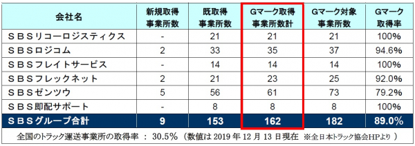 SBSグループは、(社)全日本トラック協会が昨年12月に実施した貨物自動車運送事業安全性評価事業(以下、Gマーク制度)2019年度安全性優良事業所※の評価にて、新たに9事業所が認定を受けました。これによりGマーク認定事業所数は162、取得率は、89.0%になりましたことをお知らせします。