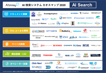 人工知能を搭載したサービスの資料請求ができるAIポータルメディア「AIsmiley」を運営するアイスマイリー(東京都渋谷区、代表取締役:板羽晃司)は、「AI検索システム カオスマップ 2020」を2020年1月21日に提供開始しました。掲載数は合計で60サービス。