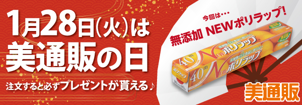 次回の「美通販の日」は2020年1月28日(火)。プレゼントアイテムは、「無添加NEWポリラップ」をご用意しました。安心・安全の添加物ゼロで使いやすい人気のポリラップを、注文された方全員に1個プレゼントいたします。また、「美通販の日」は、通販部同様、美通販池袋店でのお買い物もプレゼント対象となります。1点だけでも商品を注文・購入するだけで、素敵なプレゼントがもらえるおトクな日ですので、この機会にたくさんの方々にご利用いただければと考えております。