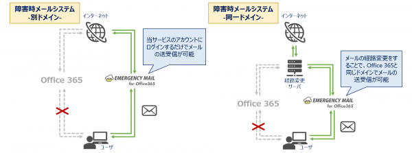『EMERGENCY MAIL for Office 365』は、Office 365のユーザーが災害や障害によりサービスを利用できなくなった際に、当社メールシステムにログインすることで、メールを継続して利用できるサービスです。別ドメインと同一ドメイン(2020年4月より提供予定)のサービス形態2種から、お客様の要望に合った運用形態を提供します。また、Office 365のメールシステムが復旧した際には、当社システムで送受信していたメールデータをOffice 365へ移すこともできるため(※2)、送受信履歴の管理に手間がかかることもありません。