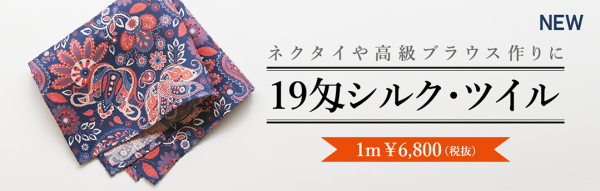 「19匁シルク・ツイル」はさらりとした柔らかい肌触りと、やや光沢感のある上質な19匁シルク100%の生地です。ブラウスやパジャマ、ネクタイ、スカーフや高級ジャケットの裏地として使用できます。