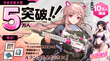 これにより、正式サービス開始時にプレイヤーには5万人達成報酬である「Aランク T-14ミホ×1」、「T-14ミホの専用装備×1」、「戦闘記録×1」、「実戦教本×1」の報酬配布が確定いたしました。
