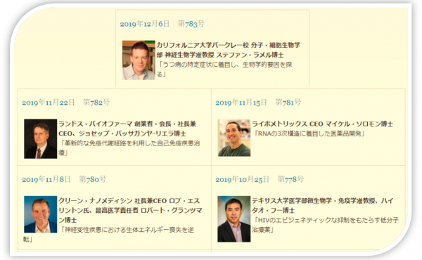 2019年12月6日に発行した783号では、うつ病における特定症状に着目し、意欲喪失を示すうつ病マウスの脳の仕組みを解明した研究について、カリフォルニア大学バークレー校、分子・細胞生物学部 神経生物学准教授のステファン・ラメル博士のインタビュー記事を掲載。このほか、最近のインタビュー記事は以下の通りです。