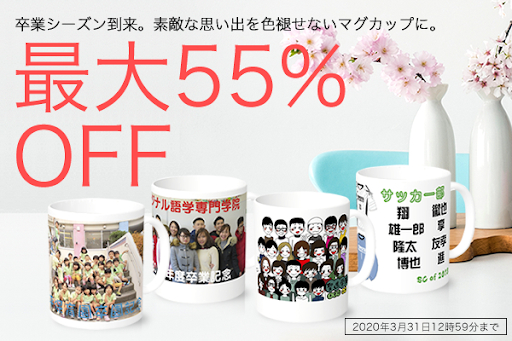 卒業記念品、贈り物の定番であるマグカップを通常価格から最大55%OFF!今だけの「プリント代最大55%OFFオリジナルマグカップキャンペーン」開催!オリジナルプリント.jpは、どこにも負けない価格と納品スピードでご提供します。昨年よりもさらに色の再現度がアップし、より高品質な仕上がりに。色褪せないマグカップで素敵な思い出作りをしてみませんか。