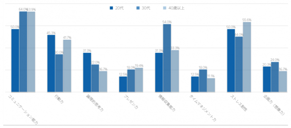 また年代別に見てみると、情報収集能力は30代が高いことがわかります。一定のITリテラシーと顧客や業界において必要な情報の取捨選択ができるため、このスキルに自信が