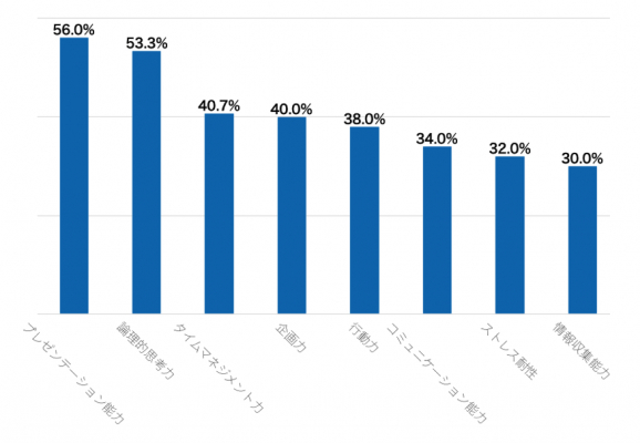 営業として不足している能力は「プレゼンテーション能力」「論理的思考力」「タイムマネジメント力」「企画力」が上位に上がりました。これらの能力は上司や年長者でもまだスキル不足と感じていることが先ほどの結果からもわかっており、社内で習得が難しいスキルと考えられます。