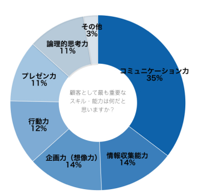 また自身に不足している能力として「プレゼンテーションスキル」や「論理的思考力」などのスキルを身につけたいという声は多いものの、一方で顧客の立場となった時には、これらの能力を強く求めているわけではなく、コミュニケーションスキルや情報収集スキルを求めていることがわかりました。