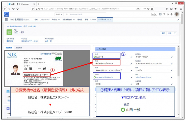 「企業データベース連携機能」では、社名変更があった場合などのメンテナンス作業を軽減し、「認識精度判定機能」では、名刺データ認識結果の確認作業を軽減します。