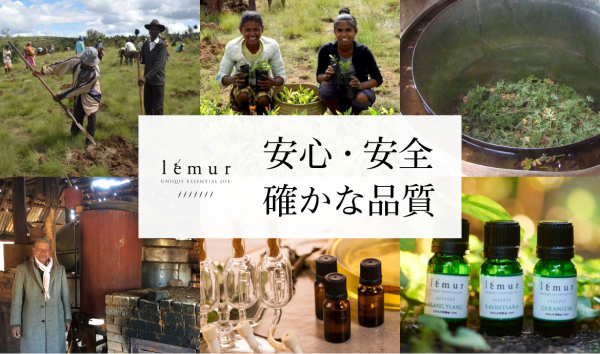 【lemur】レムールは品質に強いこだわりを持っています。有機栽培と認定されている農産物もしくは野生種の植物から蒸留された精油のみを扱っています。現地NPO監視のもとで、可能な限り小さい農家や長年家族で経営している農家から直接買い付けを行っています。そのような農家では、収穫したばかりの植物を、その場ですぐに蒸留するという生産体制をとっているからです。精油は種類によって年に何度も新しく抽出したものが届き、その都度製造バッチ(番号)をつけ、香りの確認や品質管理を適切に行っています。