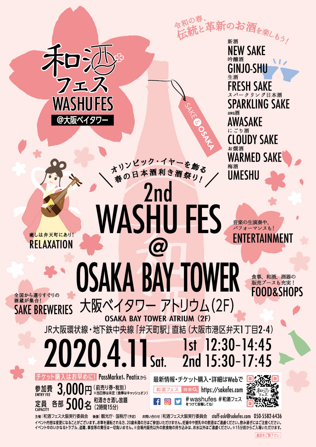 和酒フェス大阪実行委員会は、2020年4月11日(土)に「第2回 和酒フェス@大阪ベイタワー」をJR大阪環状線と大阪メトロ中央線の弁天町駅直結の大阪ベイタワー・アトリウム(大阪市港区弁天、大屋根広場、西日本最大級の温泉型テーマパーク「空庭温泉」隣接)で開催します。第1部は12時30分、第2部は15時30分から2時間15分制の利き酒会を各部500名募集します。